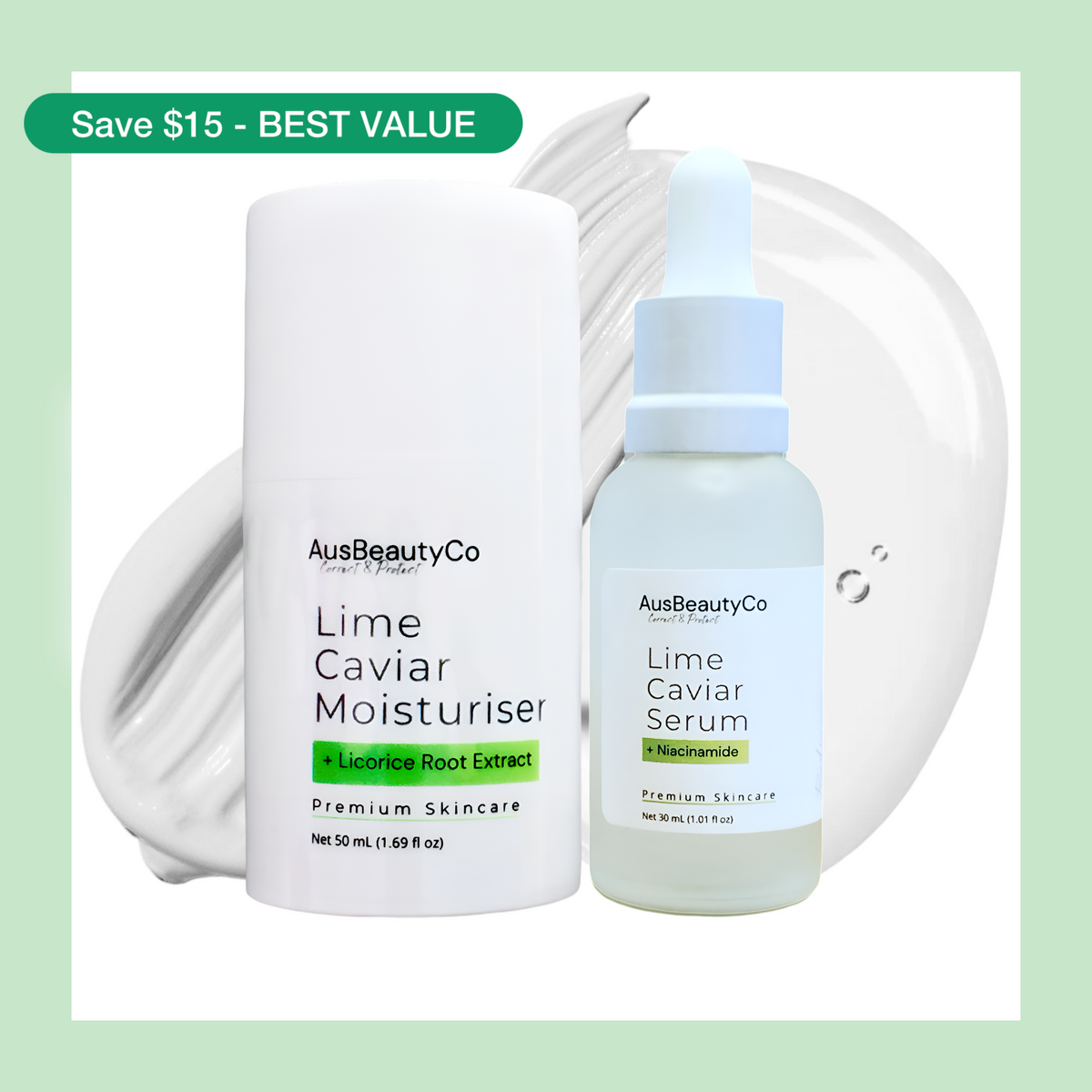 Our most popular pairing β the Lime Caviar Serum and Moisturiser together, clinically formulated to work synergistically.