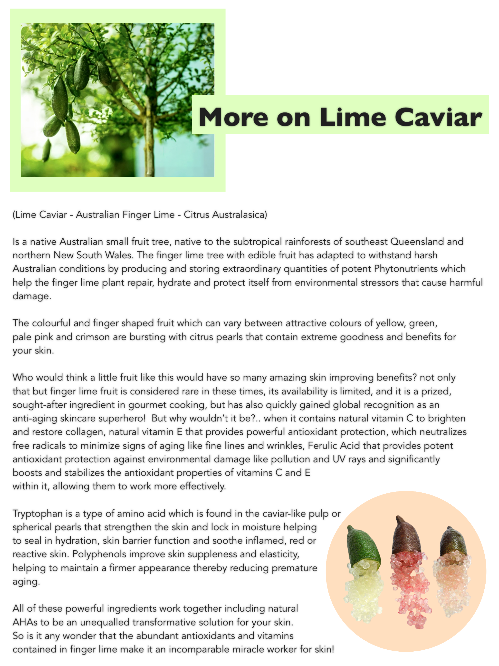 The key ingredient lime caviar is growing extremely popular due to its abundance of alpha hydroxy acids (AHAs) that renew the skin, improve complexion, lightly exfoliate, and help reduce the appearance of scars and stretch marks.