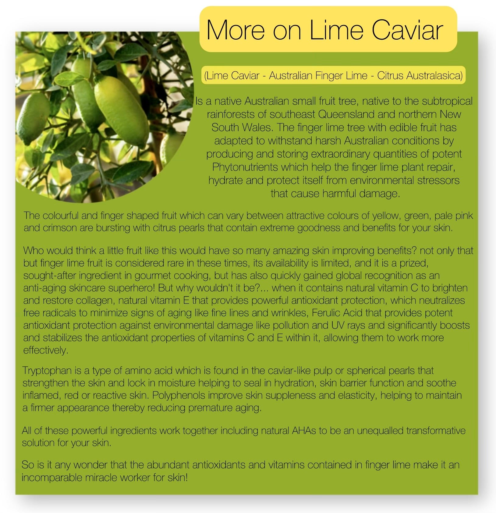 The vitamin C and antioxidants in lime caviar also protect skin from damage and contribute to its overall health and radiance.