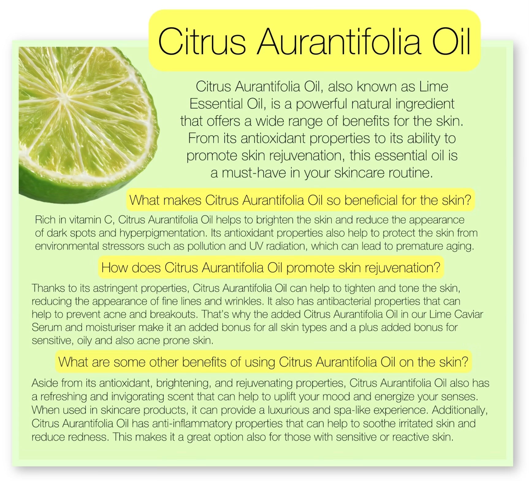 Feels like you’ve “just stepped out of a beauty salon” (The Citrus Aurantifolia Oil is what gives our Lime Caviar Serum the spa-like experience).